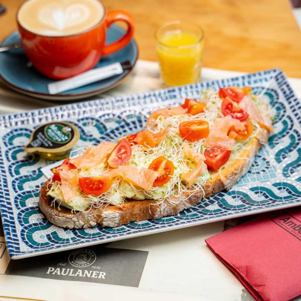 Crema de aguacate y queso crema, tomate cherry, brotes de alfalfa y tiras de salmón ahumando