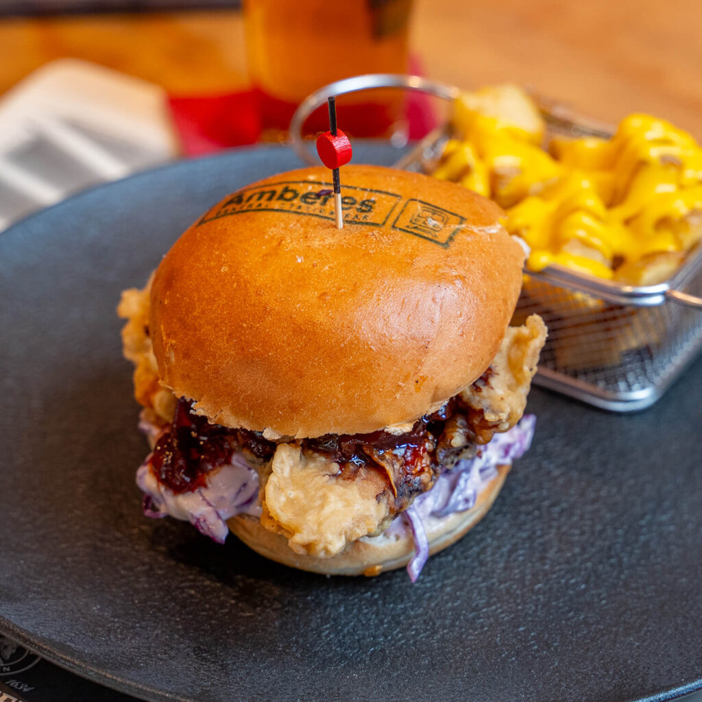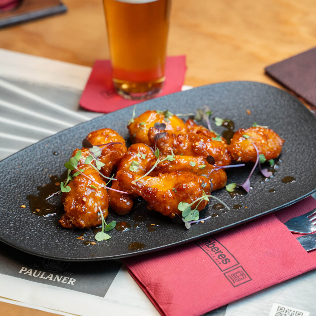 Clásico polo rebozado en salsa de soja y pimiento rostizado caramelizado, en pan brioche, col roja y mayonesa coreana