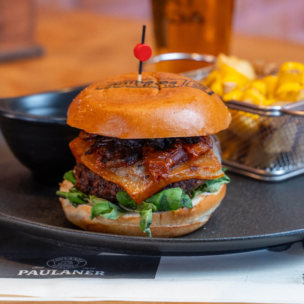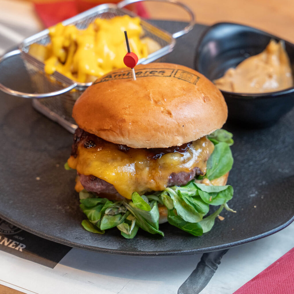 Burger de 180gr de Angus madurado, en pan brioche, canónigos, tomate, mermelada de cebola y queso cheddar ahumado y patatas y salsa baconesa