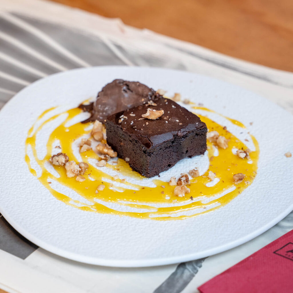 De chocolate con nueces y helado de vainila