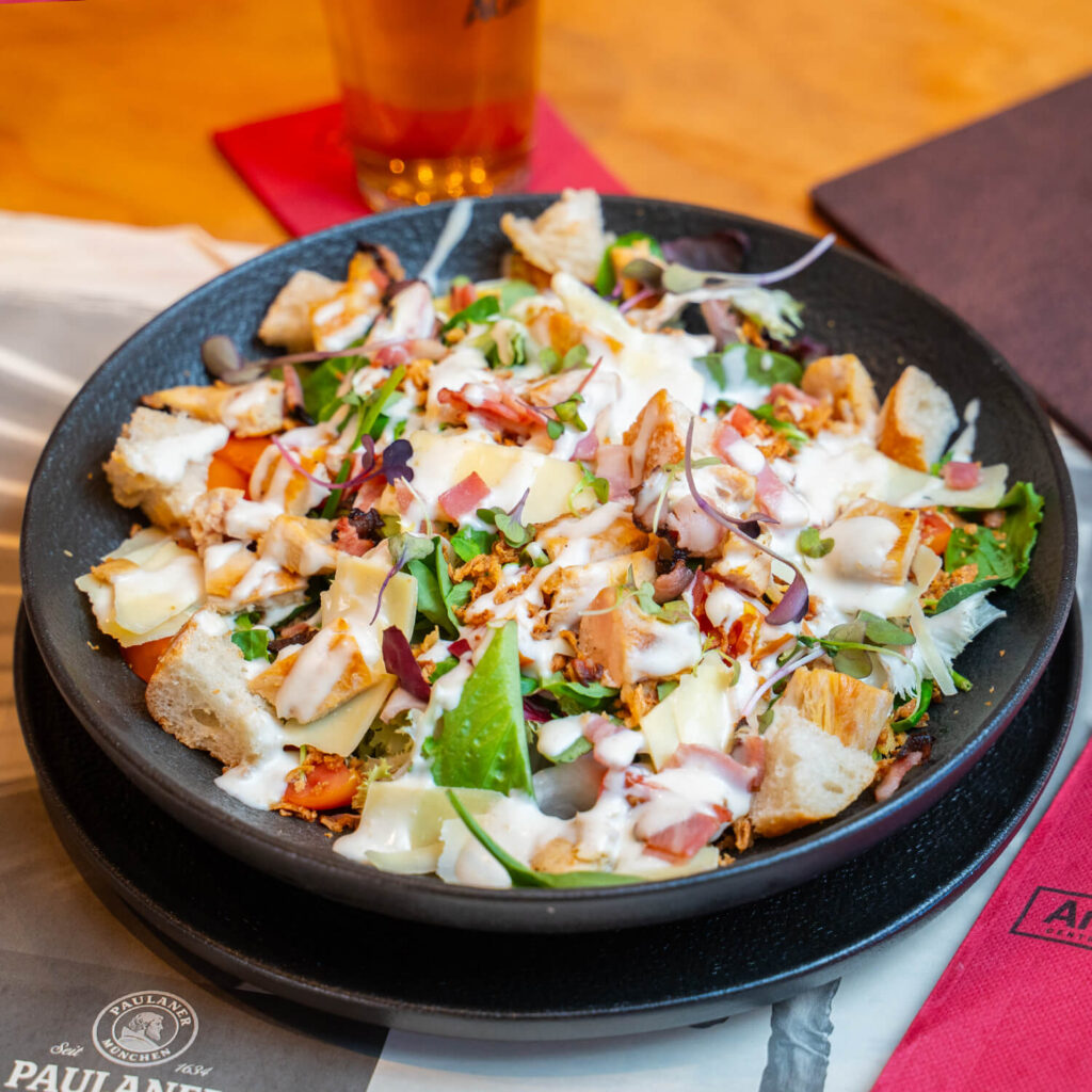 Mézclum de lechuga, bacon crujiente, escamas de queso parmesano, polo a la parrila y aderezo César