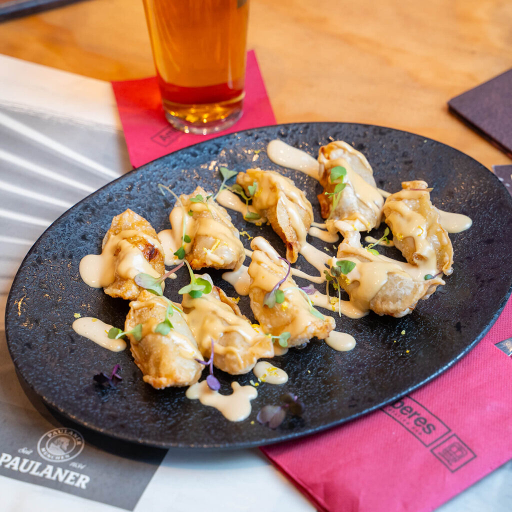 Trío de gyozas relenas de verdura, polo, cerdo, langostino y wagyu con salsa teriyaki