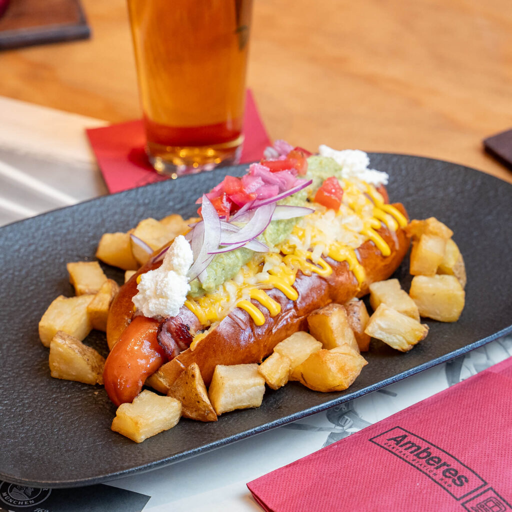 Hotdog mex al mejor estilo americano, salchicha envuelta en bacon con guacamole, pico de galo, crema agria y queso