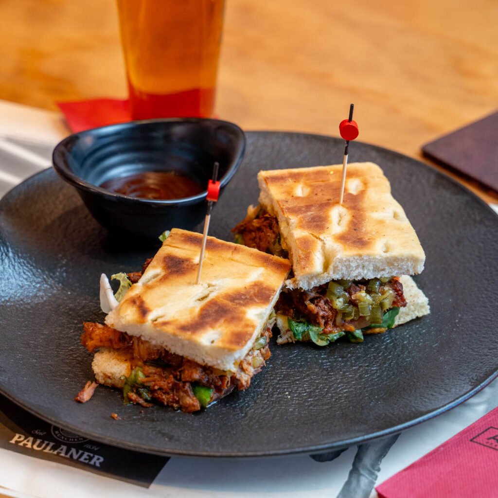 Pan focaccia, con puled pork, bacon, queso cheddar, lechuga, tomate y cama de pepinilos